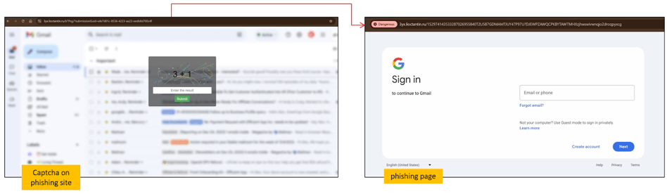 - Multi-layered redirections ending in a phishing page protected by multiple captcha verifications.