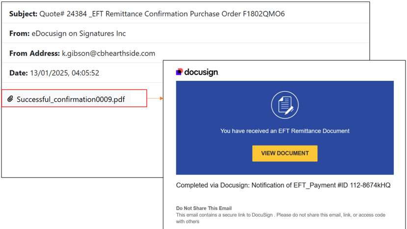 - Missing DocuSign Integrity Checks: Docusign adds Security access code for in their emails, which is missing in this PDF.