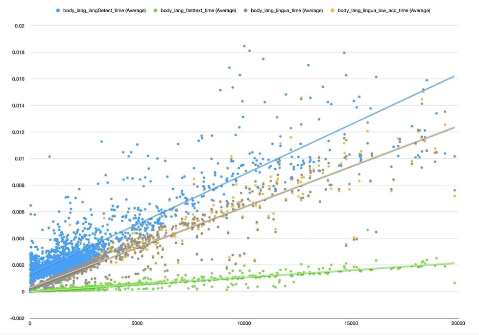 In order to identify the language of an email, we experimented with the LangDetect, FastText, and Lingua (in both standard and low-accuracy modes). In our performance evaluation of language detection libraries, we benchmarked LangDetect, FastText, and Lingua (in both standard and low-accuracy modes) across a range of input sizes to assess their computational efficiency. The results demonstrate that FastText exhibits the lowest average latency and most favorable scaling characteristics, with inference time increasing sublinearly with input length. Lingua in standard mode showed higher processing time than FastText but maintained predictable linear scaling. The low-accuracy variant of Lingua reduced latency modestly while preserving acceptable performance, making it a viable option for time-sensitive pipelines. In contrast, LangDetect incurred the highest latency and displayed greater variance in execution time, especially with longer inputs—likely due to its reliance on probabilistic models and less optimized internal logic. In the context of email processing, where throughput and low-latency inference are critical, FastText emerged as the most performant choice for language identification due to its minimal and consistent inference time. Lingua, on the other hand, offers a configurable trade-off between accuracy and performance, making it suitable for workflows where detection precision is more important than response time.