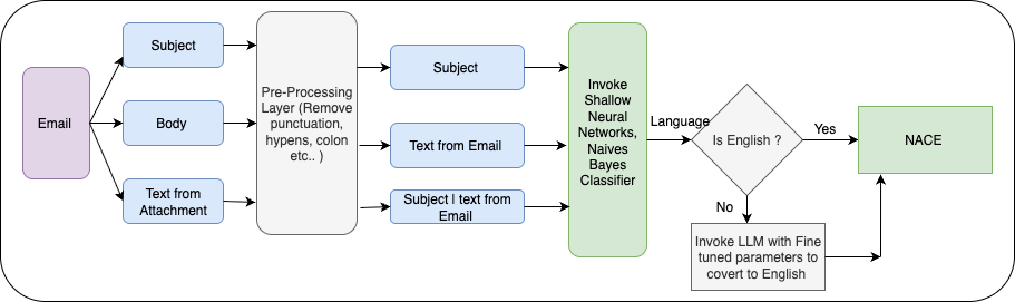 Based on experimental evaluations, FastText emerged as the most effective model for identifying the language of incoming emails. To ensure accurate intent identification across multilingual inputs, our NACE platform implements a robust language normalization pipeline. The process starts by extracting text from the subject, body, and attachments of each email. The extracted content undergoes preprocessing to remove noise—such as punctuation, hyphens, special characters etc.. If the extracted text is short, it is combined with the subject  before being passed to the language classification stage. Language detection is performed using FastText, shallow neural networks, and also by Naive Bayes models. If the detected language is English, the email proceeds directly to the NACE™ engine for semantic analysis and identification of embedded thematics—i.e., the intent of the email—and using it as a feature set for threat detection. Otherwise, an LLM is invoked with fine-tuned parameters to translate the email content into English while preserving its semantic and thematic context.