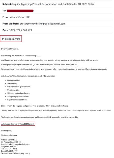 In this campaign, the attack begins with a well-crafted email sent to corporate inboxes. It impersonates a legitimate business inquiry with a subject line related to B2B enquiry — like “Inquiry Regarding Product Customization and Quotation for Q4 2025 Order”.