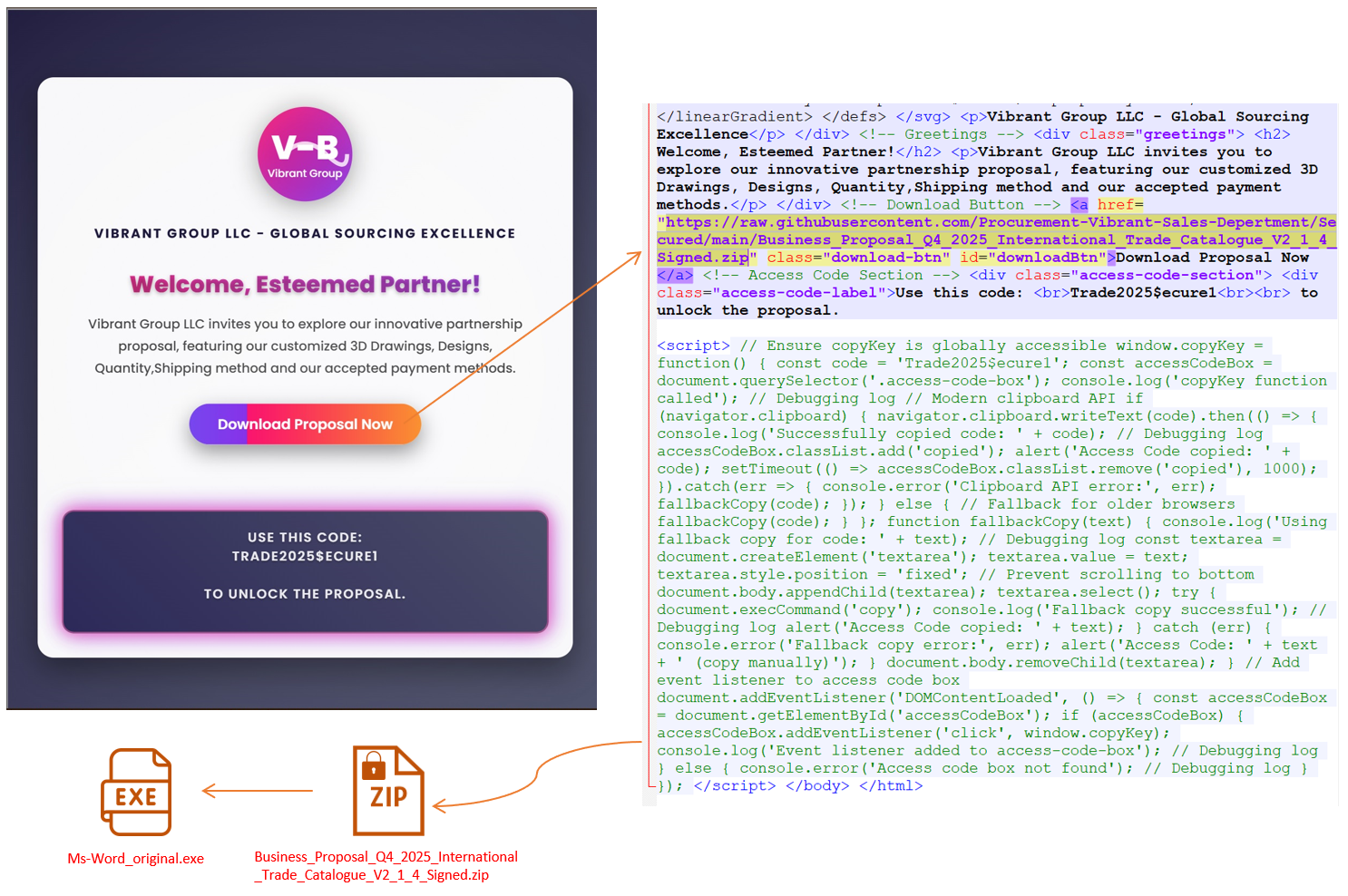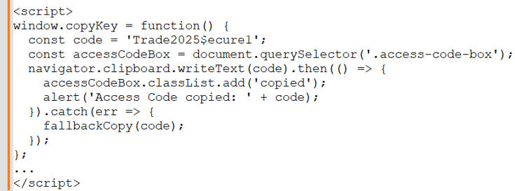 HTML has a script appended that helps the user copy the access code, which seems helpful — but is doing more than it appears. This is a subtle psychological tactic: guide the user gently toward launching the next stage without alarms.