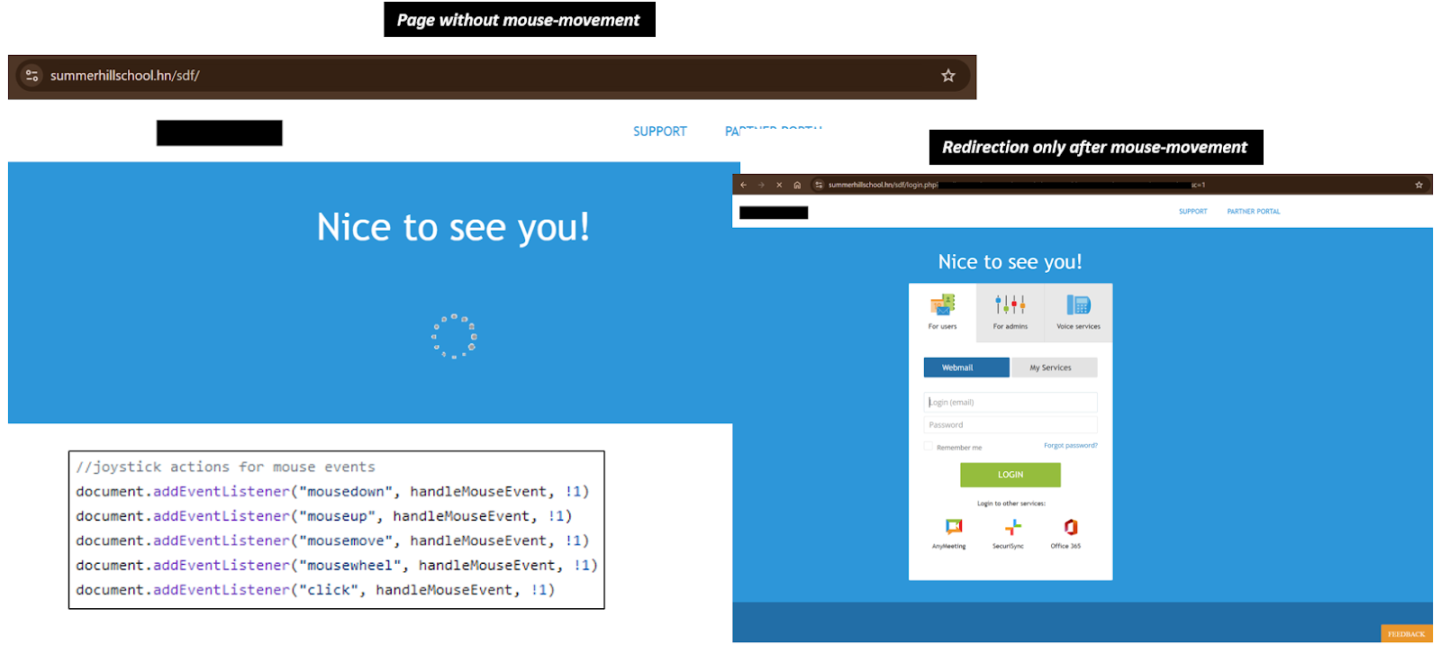[Exhibit D: Human-interaction gating used to withhold redirection until mouse-movement signals are detected, disabling automated crawler access]