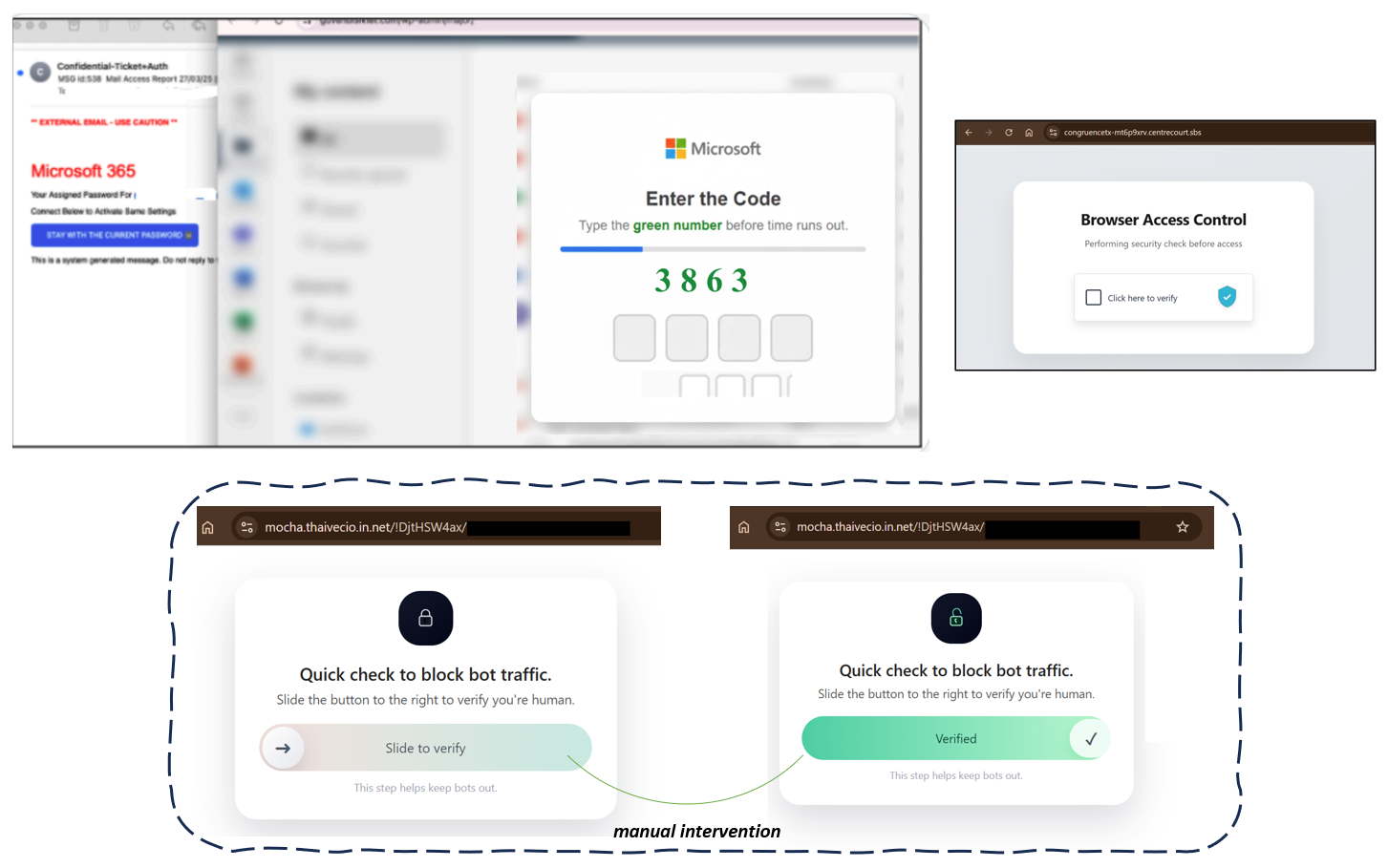 - CAPTCHA walls positioned before credential harvest (Exhibit A)