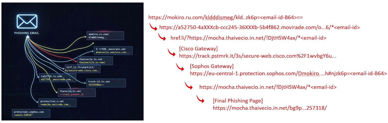 [Exhibit C: Disposable domain chaining used to rotate redirection hosts and prevent security systems from reaching the final credential page]