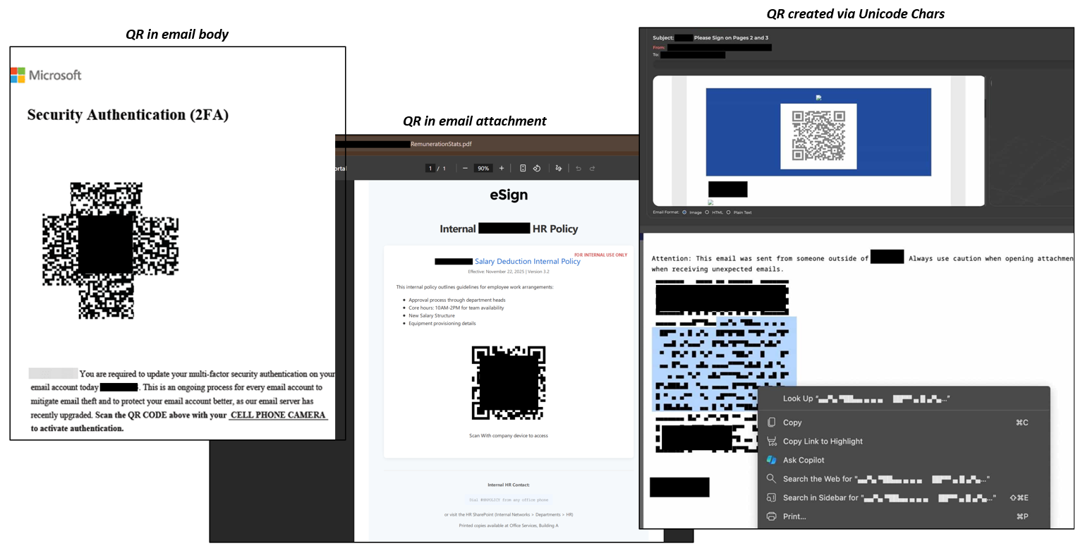 - QR-mediated bypass into legit-services where domain reputation fails (Exhibit B)